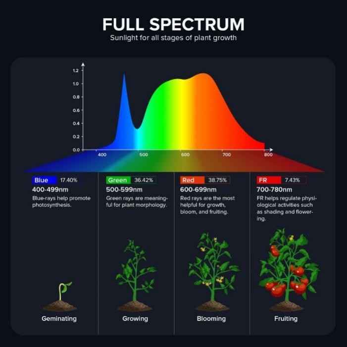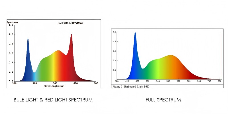 A vörös és kék fénynek csak két spektruma van a vörös-kék növekedési fényben, míg a teljes spektrumú növény fény szimulálja a napfényt, és a spektrum megegyezik a napfénymel, és fehér fényt bocsát ki. Mindkét spektrum befolyásolhatja a töltelék fényét és elősegítheti a növények növekedését. A különféle növények számára azonban ki kell választani a megfelelő spektrumot.