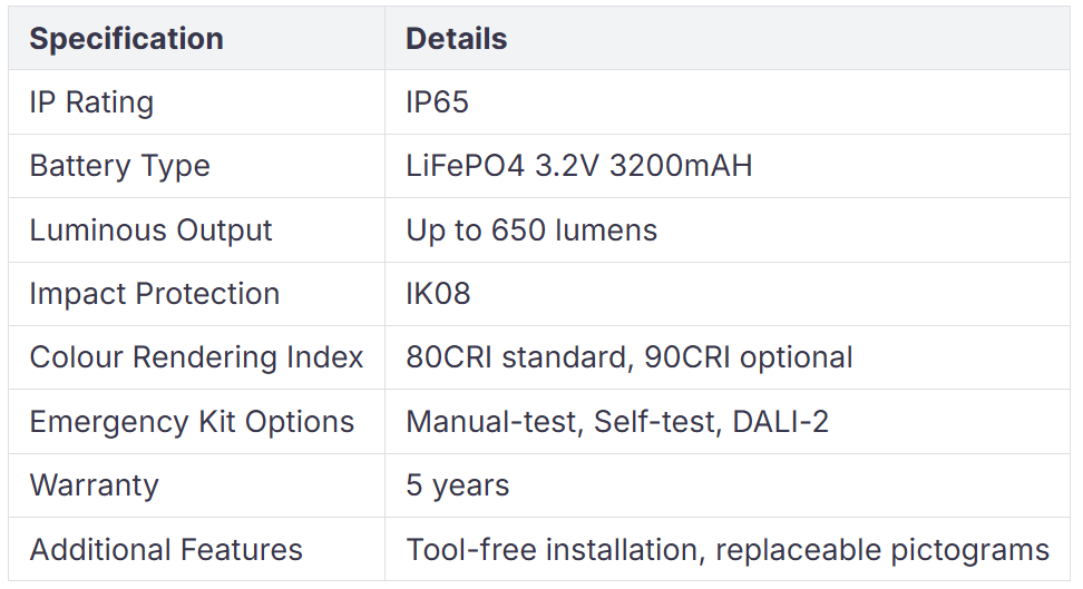 A Fanxstar ipari önálló LED-es vészválaszfala jó példa a modern vészvilágításra. Ez a vészhelyzeti szerelvény új LED-technológiát használ a fényes, egyenletes fény érdekében. Erős, IP65-ös besorolású testtel rendelkezik, így távol tartja a port és a vizet. A beépített LiFePO4 akkumulátor lehetővé teszi, hogy a lámpa hosszú ideig működjön vészhelyzetekben. A Fanxstar biztonsági válaszfallámpája szigorú biztonsági előírásoknak felel meg, ezért sok épület megbízik benne.